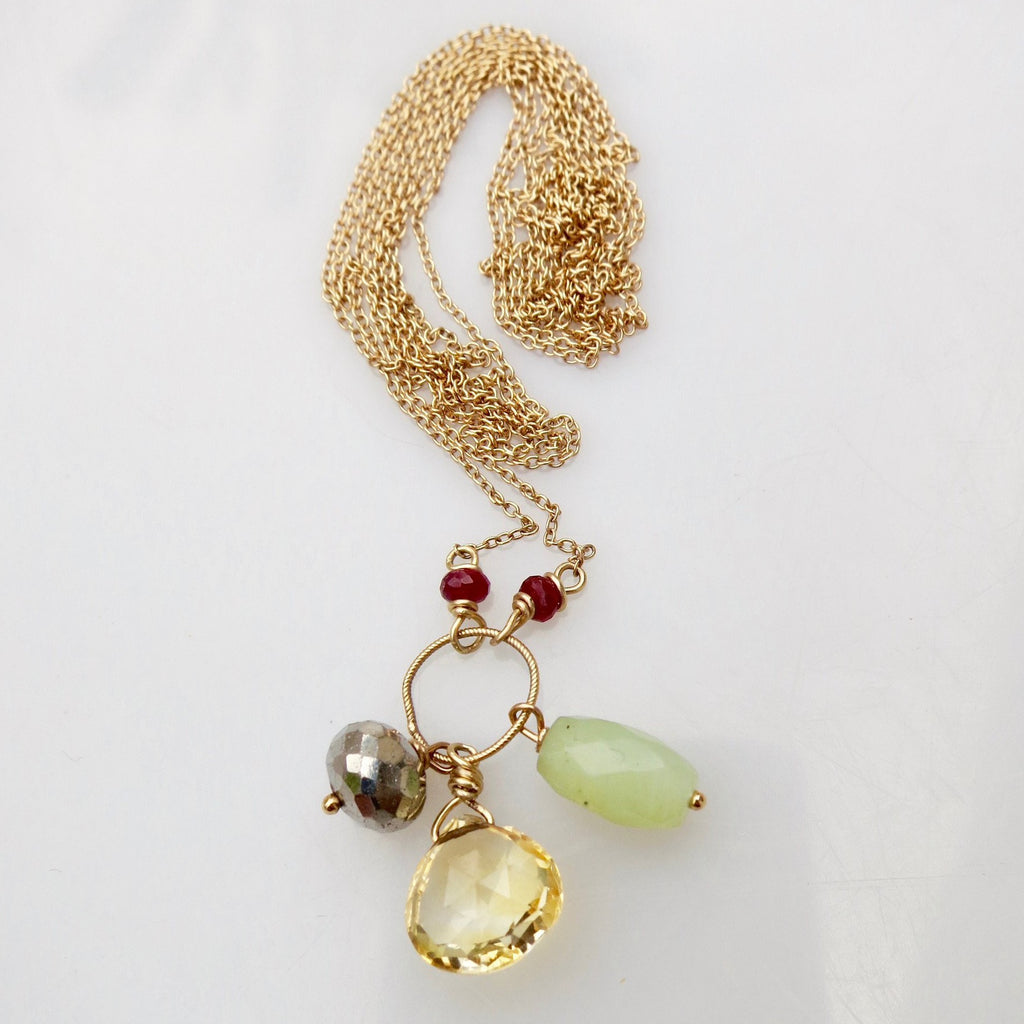 Ruby, Citrine, Aventurine and Pyrite are all stones believed to bring prosperity, abundance and success . . . Put them all together on a 37" 14k yellow gold chain and you have our Abundance Necklace . . . Wear it to attract success in all that you do!