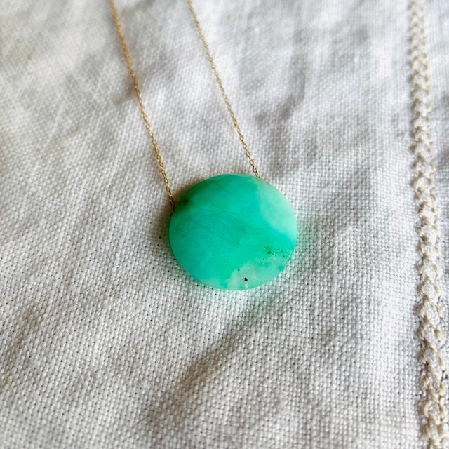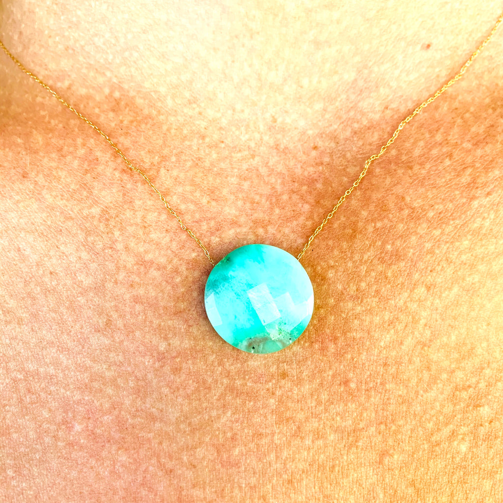 This round, faceted chrysoprase gem weighs 10.82 carats and is suspended on a very thin, 14k yellow gold chain.