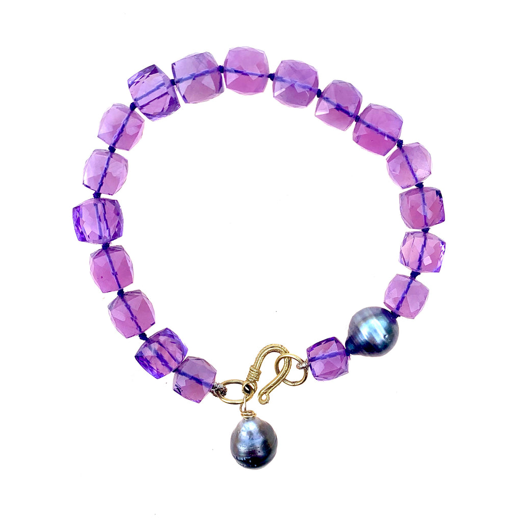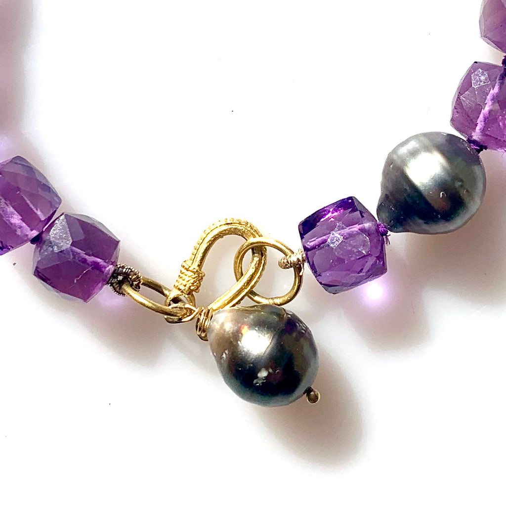 Deep purple Amethyst cubes and South Sea pearls hand-knotted on silk thread.