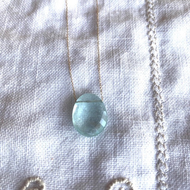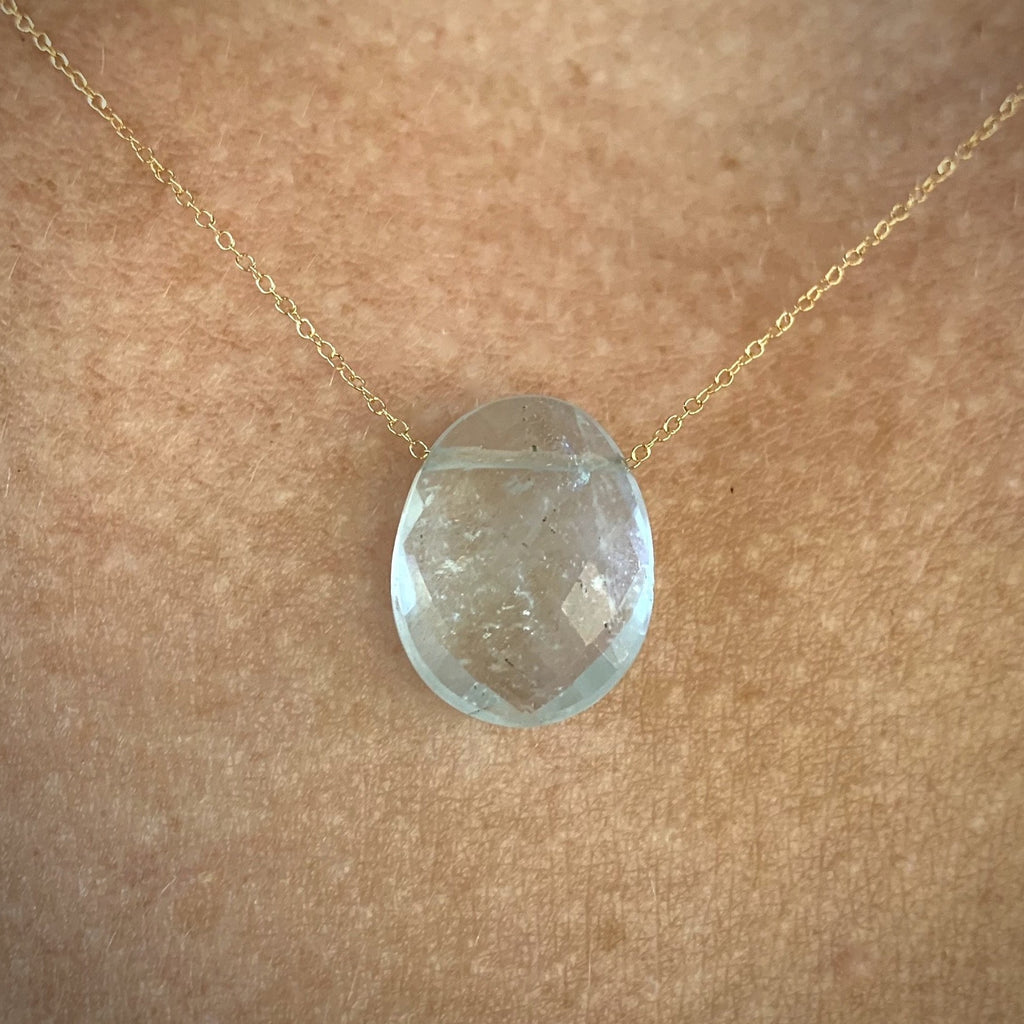 This faceted aquamarine gemstone weighs 7.14 carats and is suspended on a very thin, 14k yellow gold chain. It measures approximately 1/2" x 5/8".