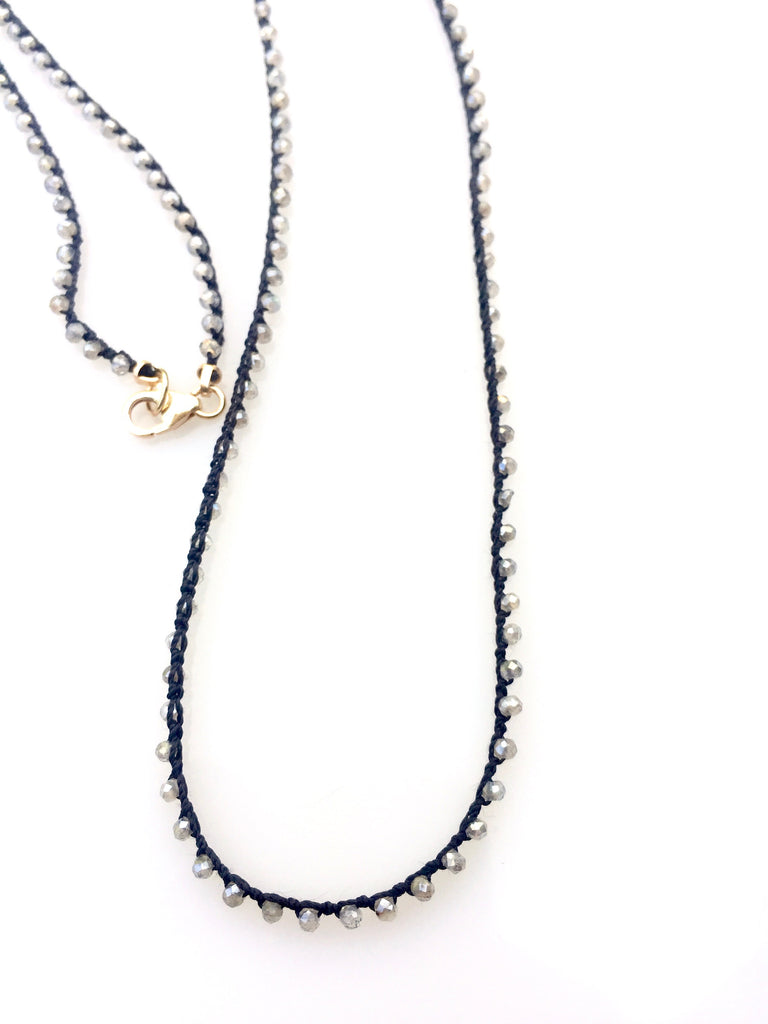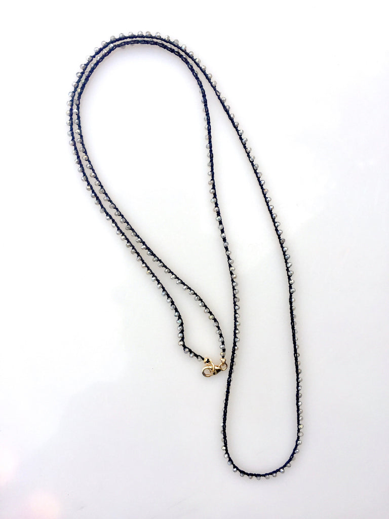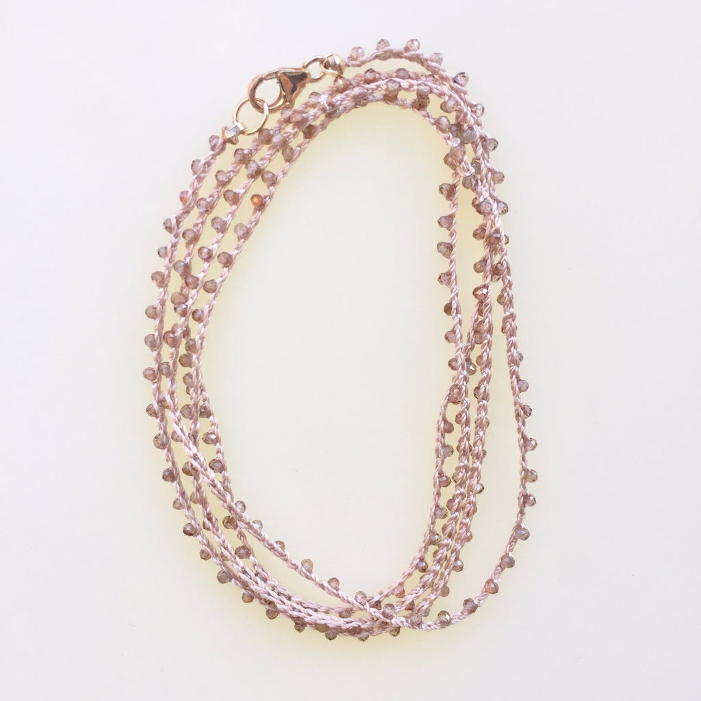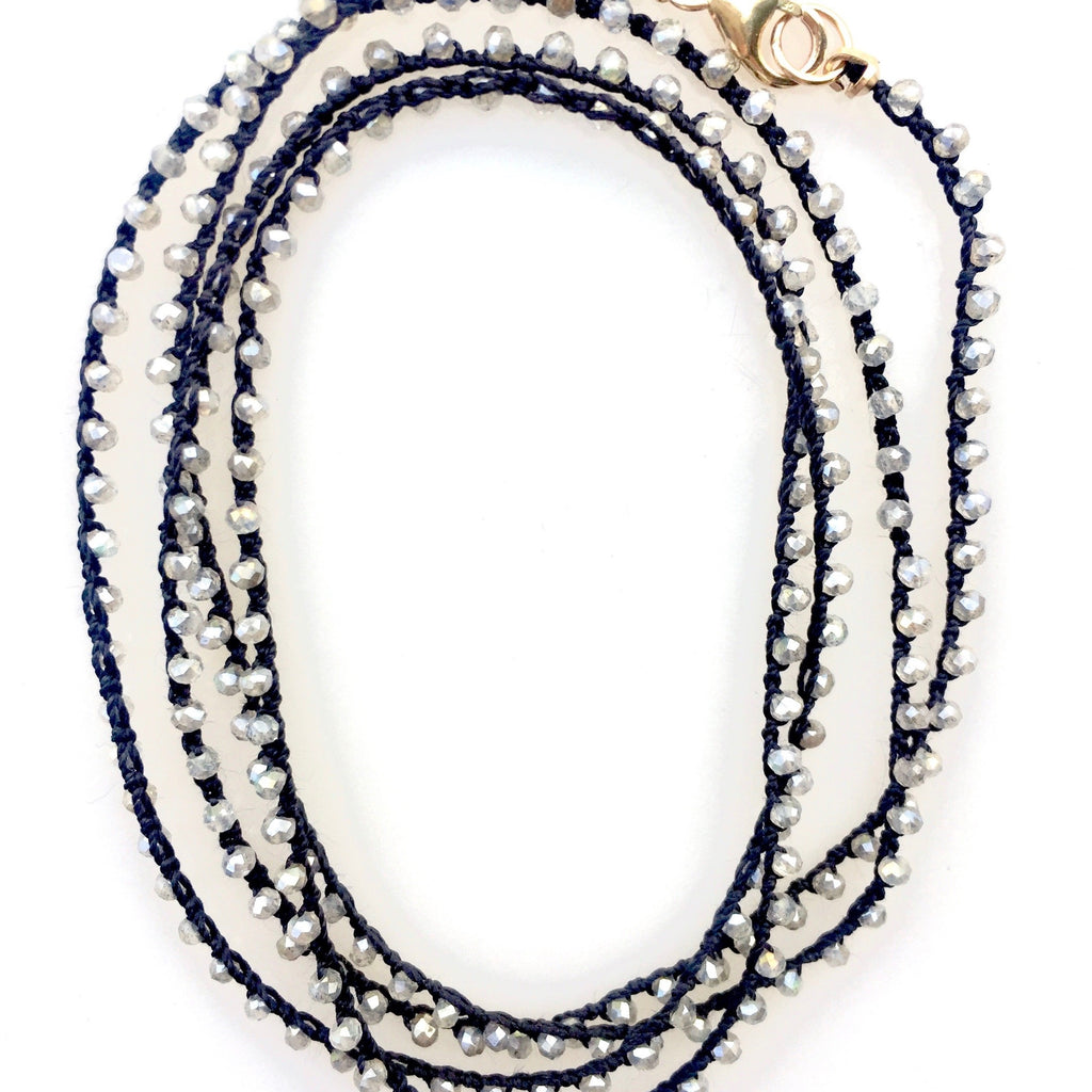This 28" hand-crocheted silk and bead necklace can be worn long, wrapped twice as a choker or wrapped 4 times around your wrist as a bracelet.